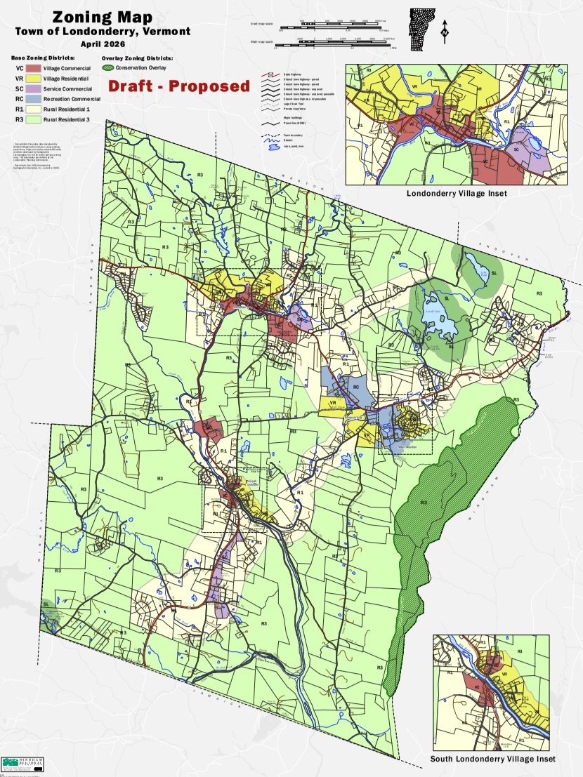 The Planning Commission is working on revising Londonderry's Zoning Bylaws. Links to the proposed By-Laws are below. "Unified Development Regulations" is the term the state uses for a set of zoning regulations that includes subdivision regulations and flood regulations.